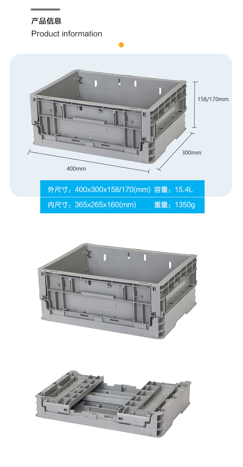 外尺寸:400*300*158/170mm 內(nèi)尺寸:365*265*160mm 材質:PP 重量:1350g