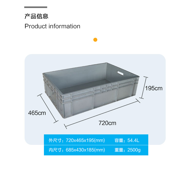 外(wài)尺寸:720*465*195mm 內尺(chǐ)寸:685*430*185mm 材質:PP 重量:2500g